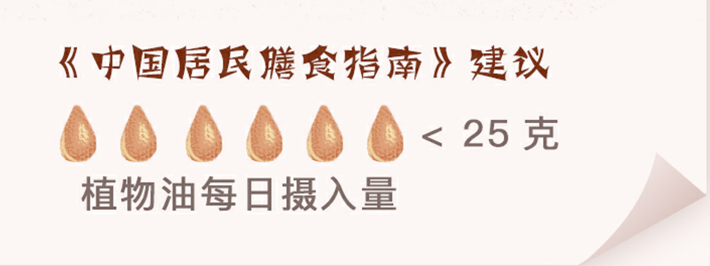 《中國居民膳食指南》建議:植物油每日攝入量不超過25克。[3]