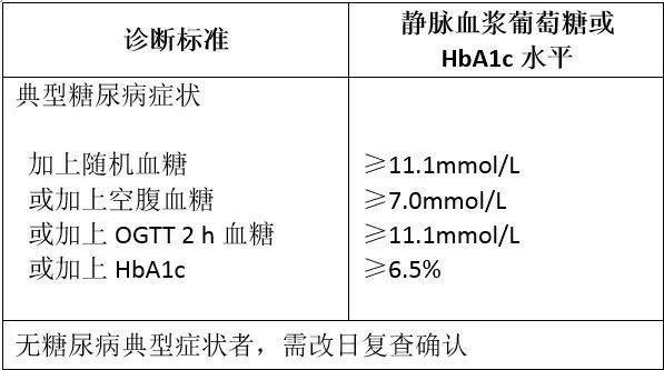 注:典型糖尿病癥狀包括煩渴多飲、多尿、多食、不明原因體重下降;隨機(jī)血糖指不考慮上次用餐時(shí)間,一天中任意時(shí)間的血糖,不能用來(lái)診斷空腹血糖受損或糖耐量減低;空腹?fàn)顟B(tài)指至少8小時(shí)沒(méi)有攝取熱量
