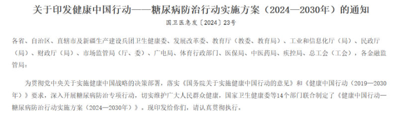 今年7月,國(guó)家衛(wèi)生健康委等14個(gè)部門(mén)聯(lián)合制定并發(fā)布了《健康中國(guó)行動(dòng)——糖尿病防治行動(dòng)實(shí)施方案(2024—2030年)》(簡(jiǎn)稱“實(shí)施方案”),明確了2024年至2030年糖尿病防治工作的總體要求,提出要堅(jiān)持預(yù)防為主,創(chuàng)新醫(yī)防融合機(jī)制,形成有利于糖尿病防治的生活方式、生態(tài)環(huán)境和社會(huì)環(huán)境,降低因糖尿病及其并發(fā)癥導(dǎo)致的死亡和傷殘,提升人民群眾健康素養(yǎng)水平。實(shí)施方案特別提出,要實(shí)施重大科技攻關(guān),加快創(chuàng)新成果轉(zhuǎn)化,支持新技術(shù)、新產(chǎn)品在糖尿病防治領(lǐng)域推廣應(yīng)用。