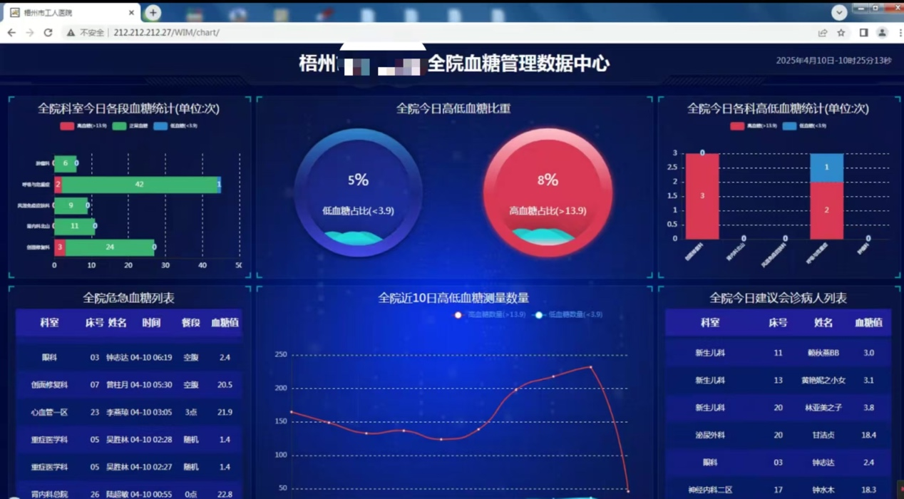 在廣西梧州市某公立醫(yī)院全院血糖管理中心,可以看到閃爍的數(shù)字化大屏上患者的血糖數(shù)據(jù)時(shí)時(shí)動(dòng)態(tài)顯示,全院各科室血糖數(shù)據(jù)及時(shí)同步,危急會(huì)診情況一目了然……