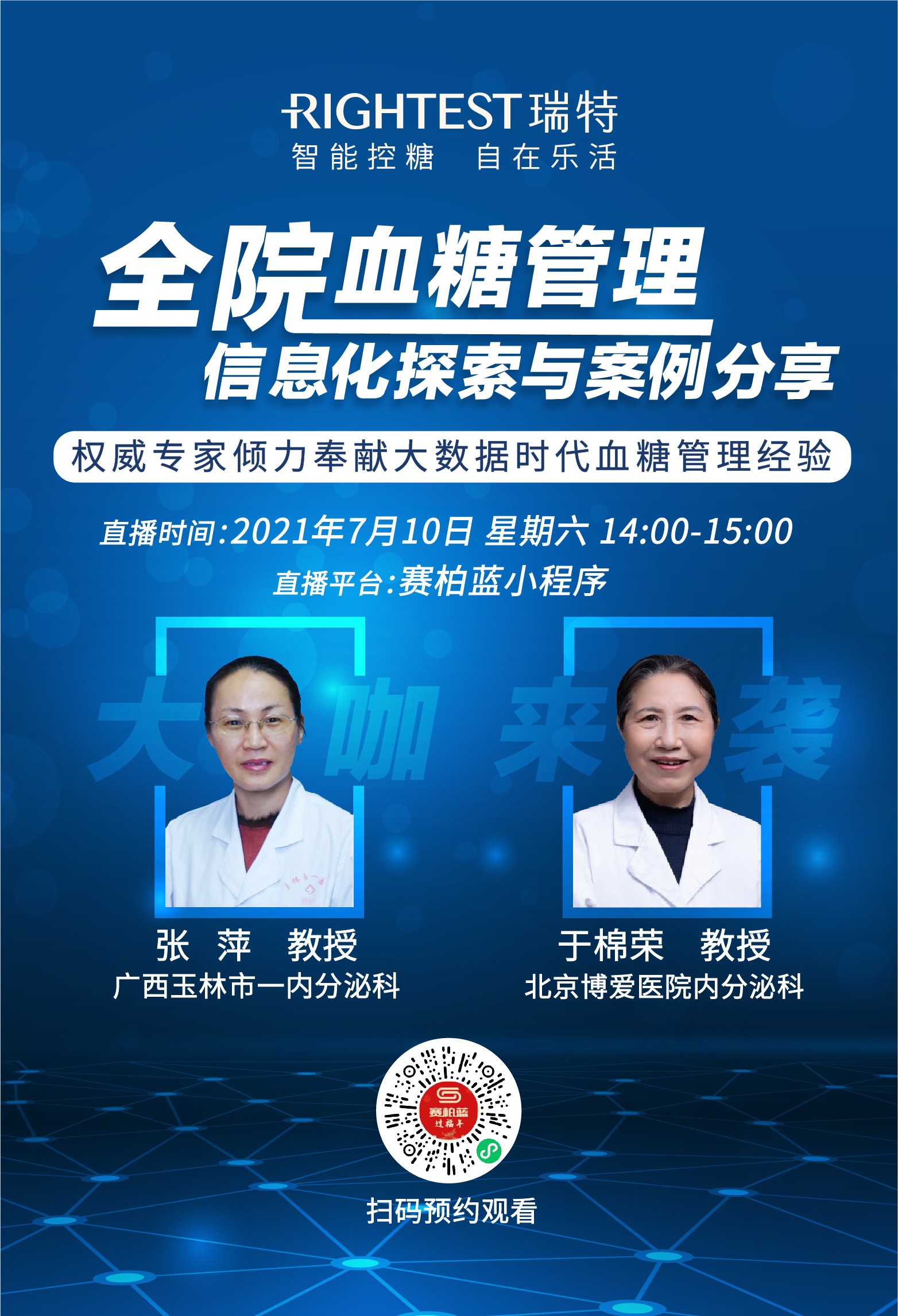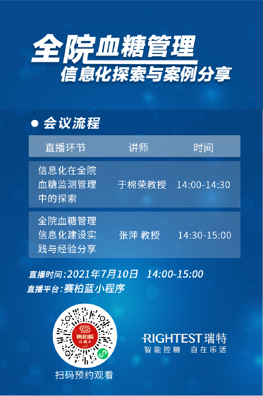 互聯(lián)網(wǎng)技術(shù)日益發(fā)展的今天,這一問題是否已經(jīng)有了理想的解決方案?華廣瑞特攜手醫(yī)療行業(yè)垂直平臺“賽柏藍”將邀請張萍、于棉榮兩位內(nèi)分泌科資深專家于7月10日進行線上學術(shù)直播會議,結(jié)合當前政策背景及嘉賓豐富的從業(yè)經(jīng)驗帶來全院血糖信息化管理的經(jīng)驗分享。